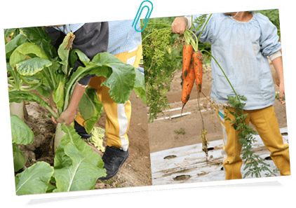 法人の畑で収穫された新鮮な野菜たっぷりの給食です。お肉や魚、お米やパン、麺類もバランスよく食べれるように献立を立てています。3大アレルゲンフリー献立の日を組み込んで、みんなで同じものをおいしく食べる機会もつくっています。